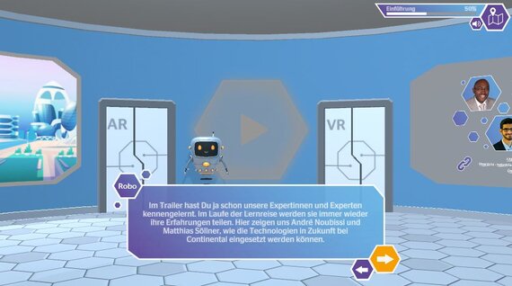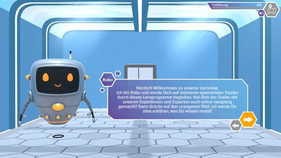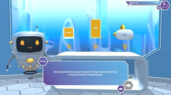 Für das eLearning wurden verschiedene didaktische Ansätze miteinander kombiniert. So werden die Anwendungsszenarien im Storytelling-Format entwickelt. Die zentrale Besonderheit des eLearnings ist jedoch die komplett neu entwickelte und interaktive 3D-Lernwelt, die gerade dem inhaltlichen Schwerpunkt AR/VR entgegenkommt. Das E-Learning beinhaltet eine eigens entwickelte, intuitive Navigation in Form einer „Progress-Bar“, die einerseits eine Übersicht über bereits erledigte Lernabschnitte liefert und andererseits den Fortschritt im Kapitel anzeigt.